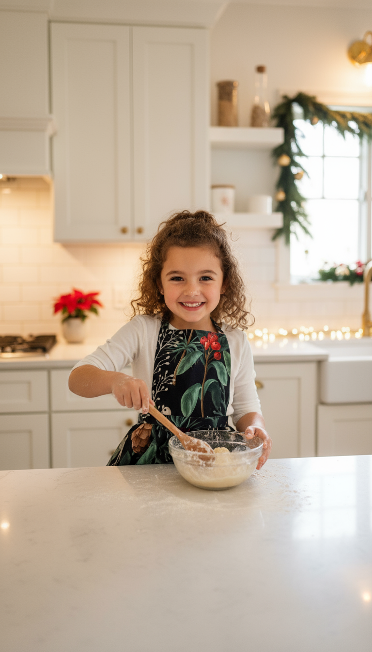 Vánoční dětská zástěra 'Christmas forest' z dílny Hortensias Home je ideální pro všechny malé kuchařky a kuchaře. Ručně ušitá v Lotyšsku z kvalitní evropské bavlny, zdobená romantickými volánky a jedinečným motivem zimního lesa. Bezpečně ochrání oblečení při pečení, tvoření a hře v kuchyni. A co je nejlepší? Stejný vzor najdeš i ve velikosti pro dospělé – budeš dokonale sladěná s mámou!
