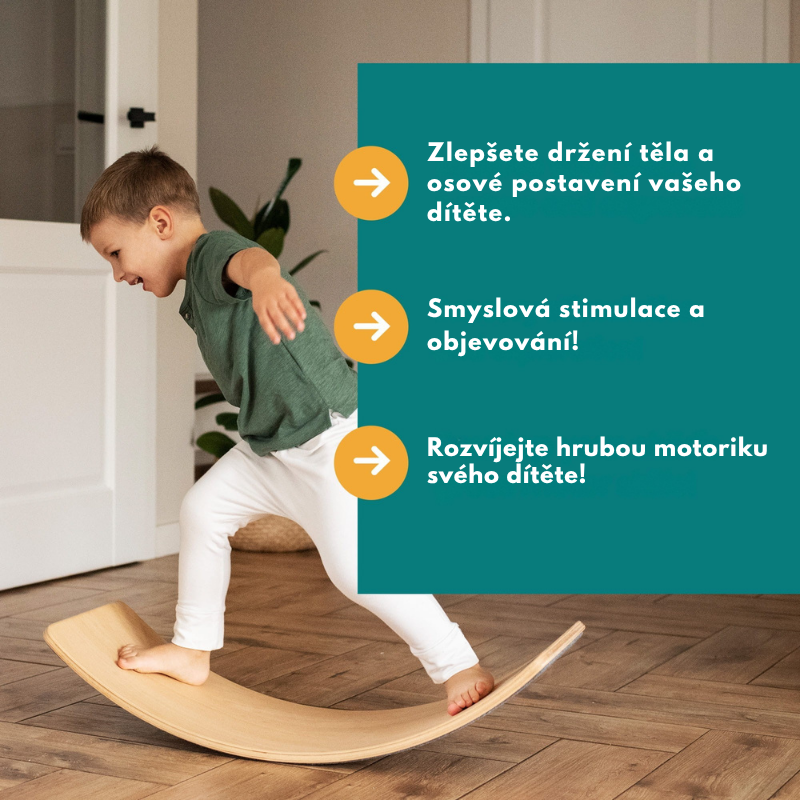 Desku můžete využít pro hravou i kondiční aktivitu doma i venku – dítě na ní může stát, sedět, houpat se nebo ležet, trénovat rovnováhu, tvořit překážkové dráhy nebo ji převrátit na „most“ či „skluzavku“. Skvělá i pro děti se speciálními potřebami při rehabilitaci nebo smyslové stimulaci.