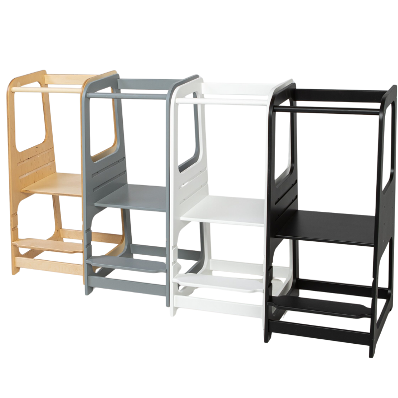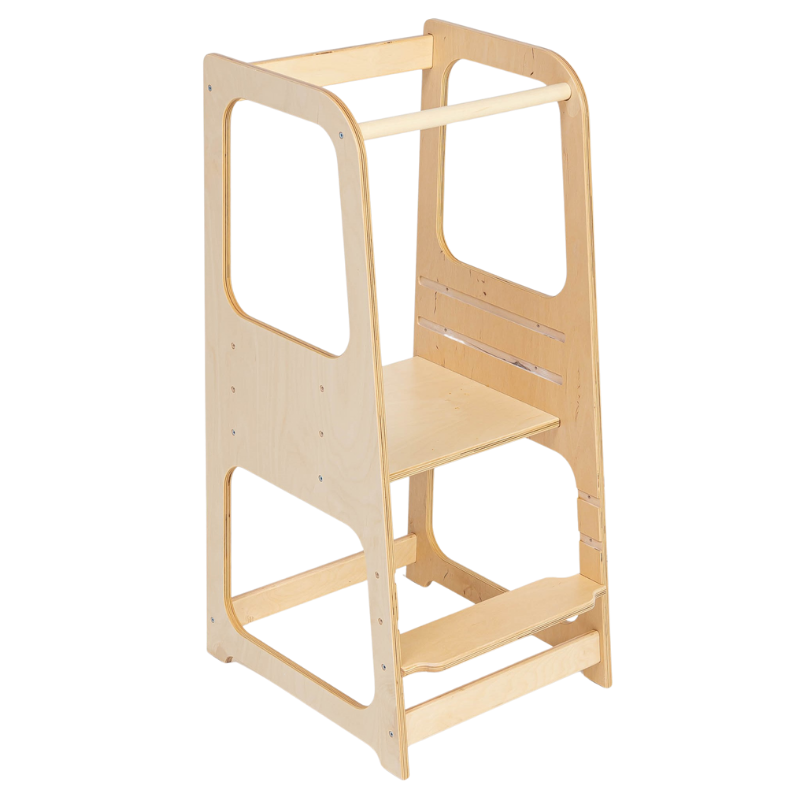 Montessori učící věž je navržena tak, aby podporovala samostatnost a zapojení dětí do každodenních činností. Umožňuje dětem bezpečně dosáhnout na pracovní plochy v kuchyni nebo koupelně, čímž se stávají aktivními účastníky domácího života. Vyrobena z kvalitní březové překližky, nabízí stabilní a bezpečné prostředí pro malé průzkumníky.