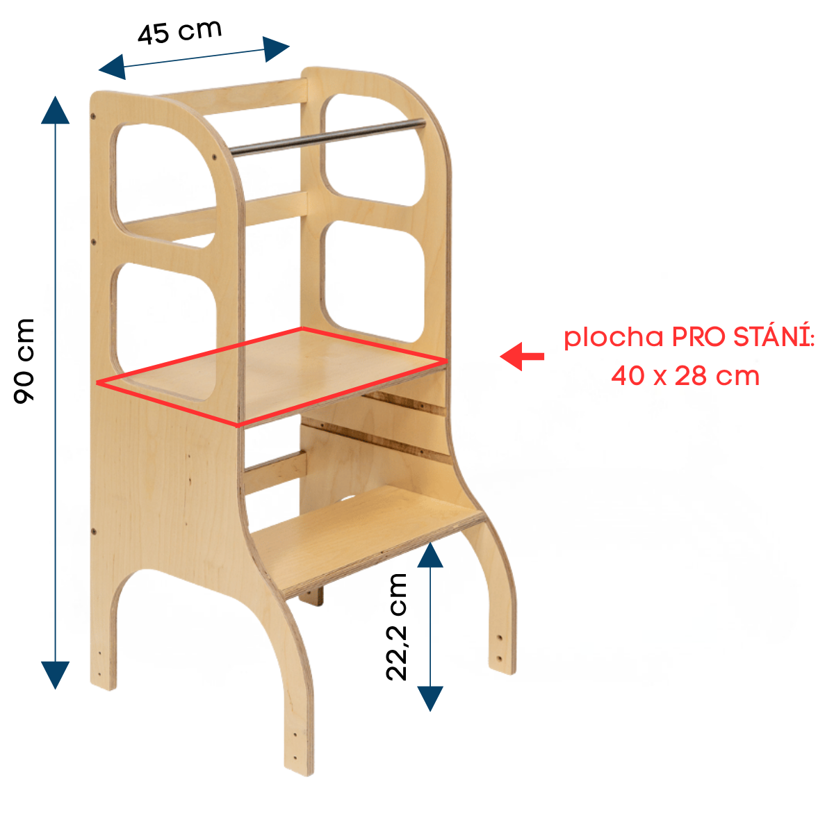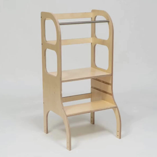 Montessori věž STEP UP® s nastavitelnou výškou je ideální pomocník pro všechny zvídavé děti, které chtějí bezpečně pomáhat v kuchyni, dosáhnout k umyvadlu nebo se zapojit do každodenních aktivit. Odlehčená, ale zároveň stabilní konstrukce z březové překližky vydrží roky používání a nezabírá téměř žádné místo. Díky výškově stavitelné plošince věž poroste s dítětem – stačí nastavit úroveň podle aktuálních potřeb. Povrch je upravený vodou ředitelným UV lakem a splňuje přísné evropské bezpečnostní standardy.