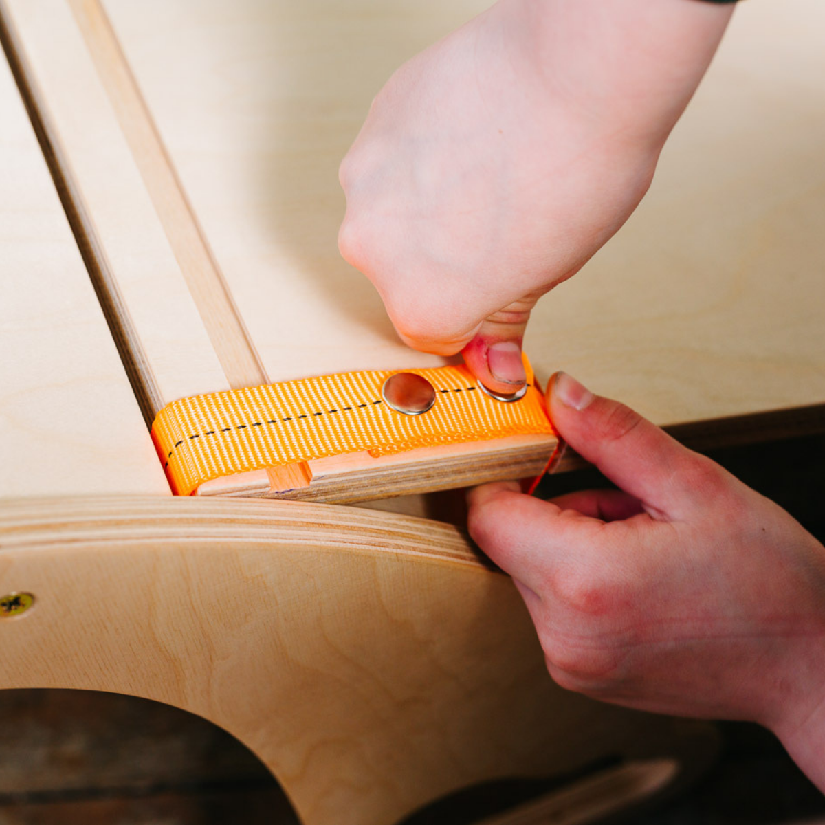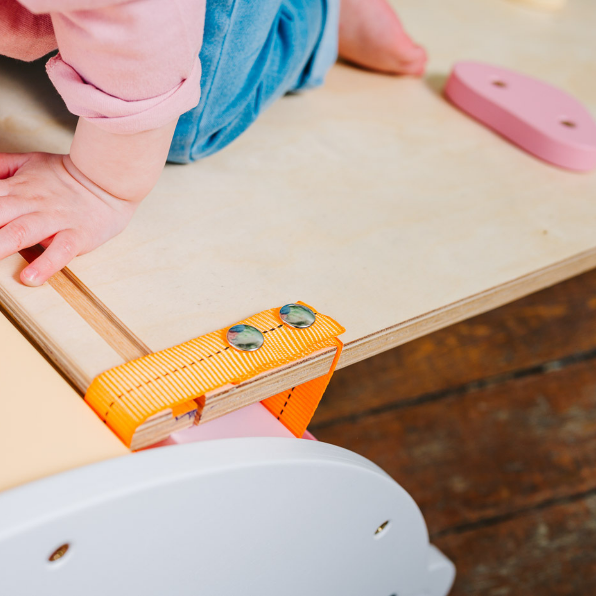 Je z pevné březové překližky s bezpečnou, zdravotně nezávadnou pastelovou povrchovou úpravou.