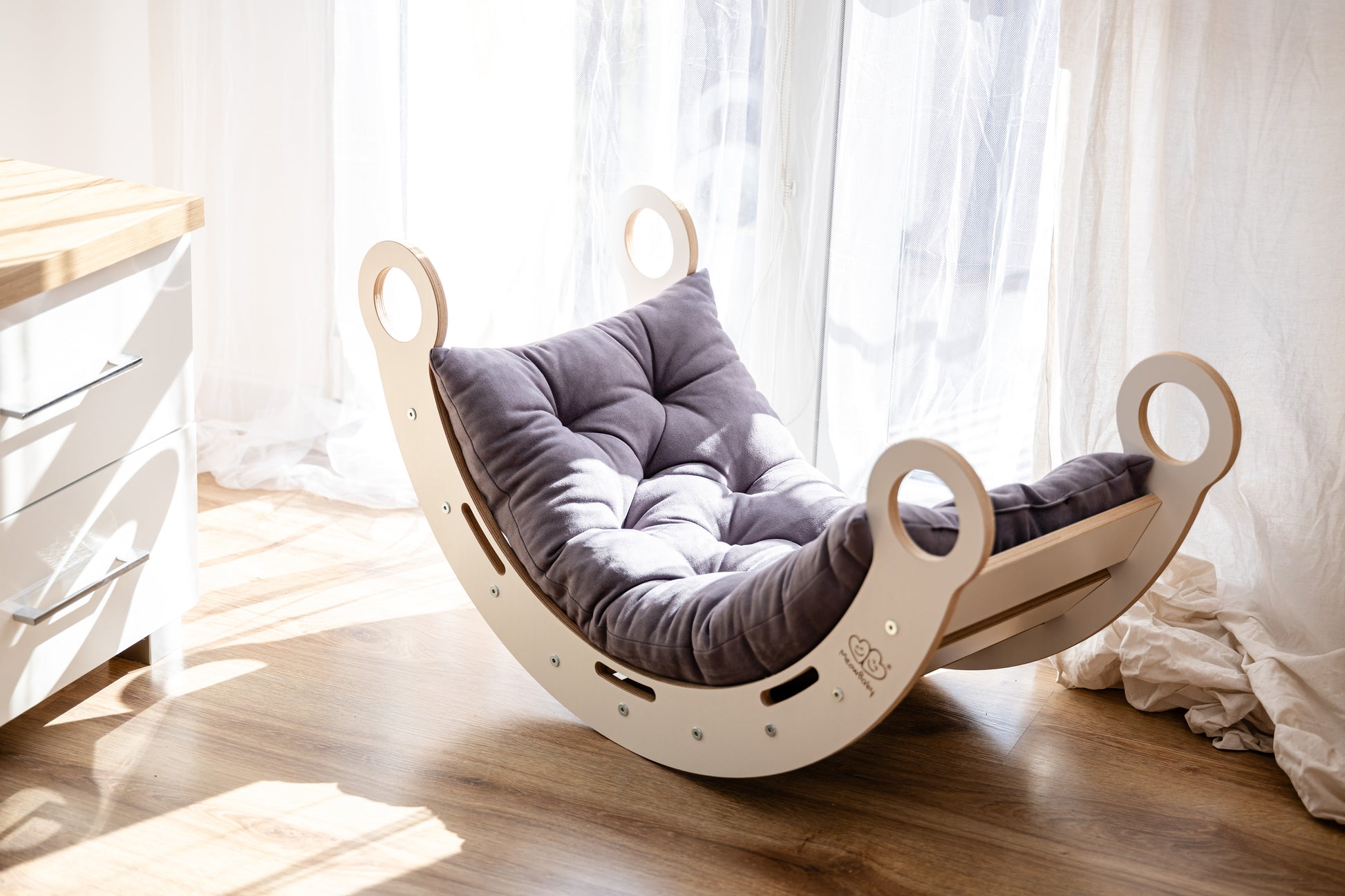 | Materiál | Bílá lakovaná dřevěná překližka, certifikované bezpečné laky, polštář z příjemné textilie |